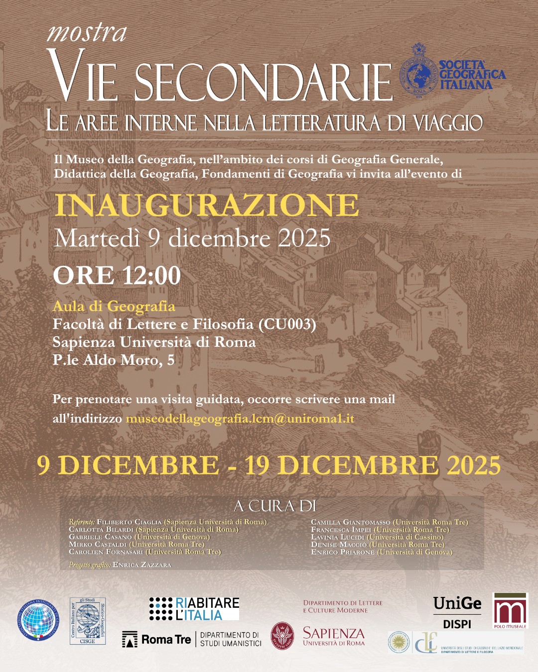 Martedì 9 dicembre 2025, nell'ambito delle attività che fanno capo al Polo Museale Sapienza e al Dipartimento di Lettere e Culture Moderne, in collaborazione con l'Associazione Italiana Insegnanti di Geografia (AIIG), il Museo della Geografia inaugura la mostra Vie Secondarie. Le aree interne nella letteratura di viaggio, risultato di un progetto di ricerca congiunto che ha coinvolto studiose e studiosi provenienti da quattro atenei: Sapienza Università di Roma, Università Roma Tre, Università degli Studi di Genova e Università di Cassino e del Lazio Meridionale.